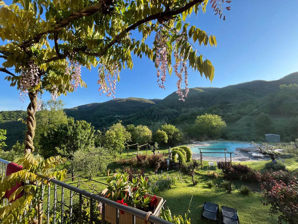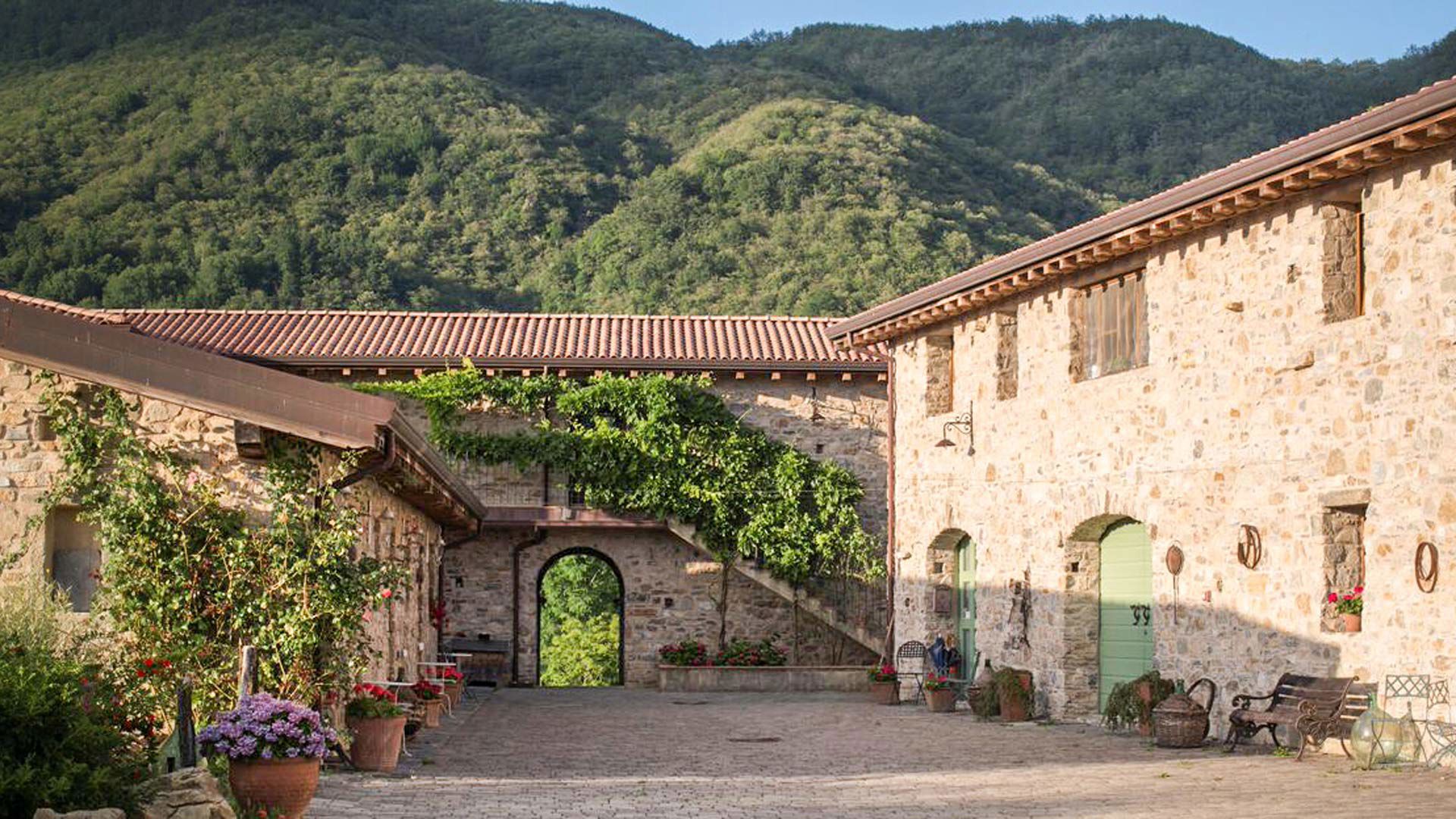 Each room and suite has independent access and opens onto the surrounding landscape, with shared gardens or terraces that extend the living space outdoors and frame wide views across the estate and the Magra Valley beyond.